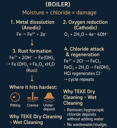 When hot gas meets a cool, slightly damp metal surface, moisture condenses and dissolves chloride salts/gases. That kick-starts a rapid corrosion cycle.